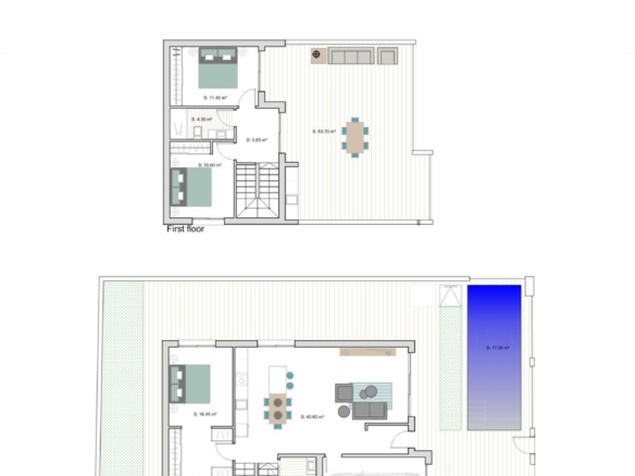 Op de begane grond biedt de villa een open woon- en eetkamer met een moderne keuken en directe toegang tot het terras, het zwembad en de garage. Op deze verdieping bevindt zich ook een grote slaapkamer met inloopkast en en suite badkamer, plus een extra gastenbadkamer. De eerste verdieping beschikt over twee slaapkamers die een badkamer delen en een royaal onoverdekt terras van 53 m2, ideaal om te ontspannen, gasten te ontvangen en te genieten van het mediterrane klimaat.